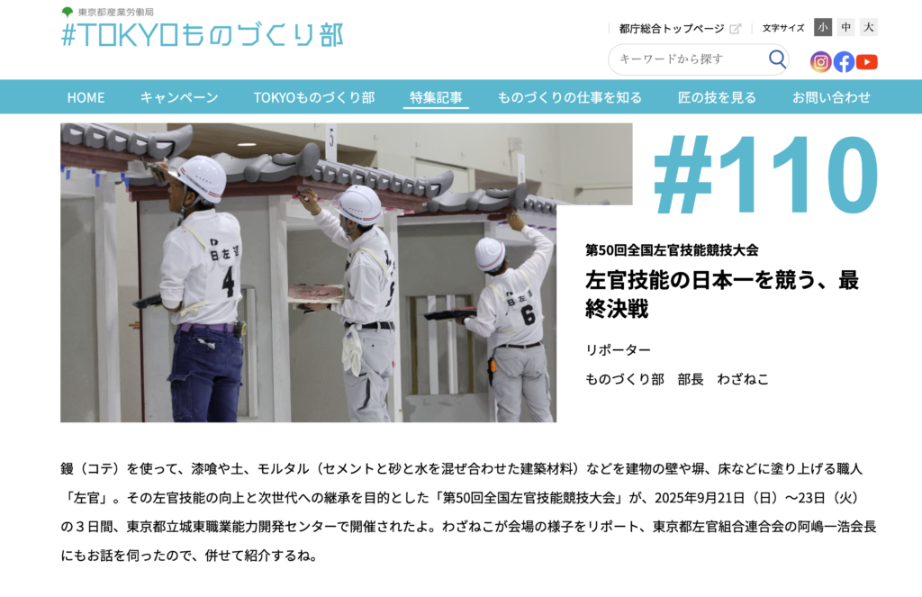 東京都産業労働局が主催する「#TOKYOものづくり部」より第50回全国左官技能競技大会についてインタビューを阿嶋代表が受け東京都のホームページ上に掲載されました
