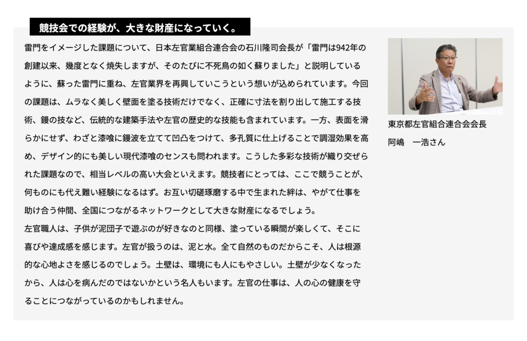 この度、第50回全国左官技能競技大会について、東京都左官組合連合会会長の弊社阿嶋代表が東京都産業労働局からインタビューを受けました。下記のサイトに内容が記載されております。ぜひ東京都のホームページをお読みいただけますようお願い致します。